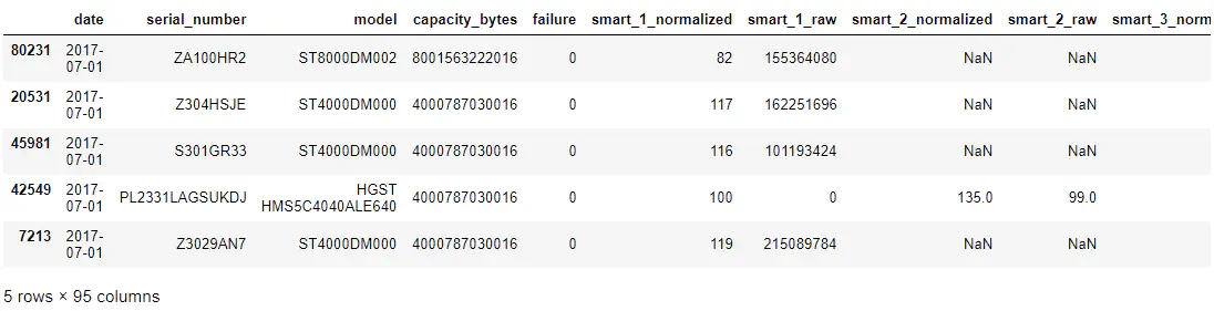 Her er nogle eksempelrækker fra BackBlaze datasættet::