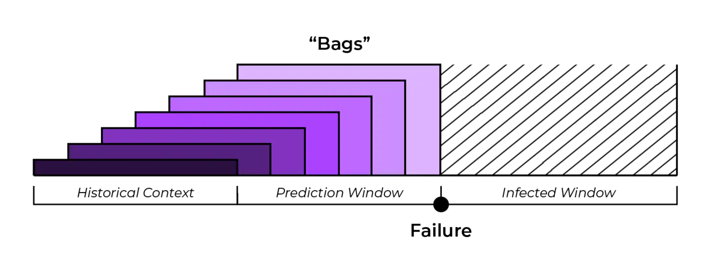 Vi tager hver logget harddiskfejl og laver en “bag” for hver 7 dage (forudsigelsesvindue), der kom foran den, der indeholder alle begivenheder 7 dage før den (historisk sammenhæng).