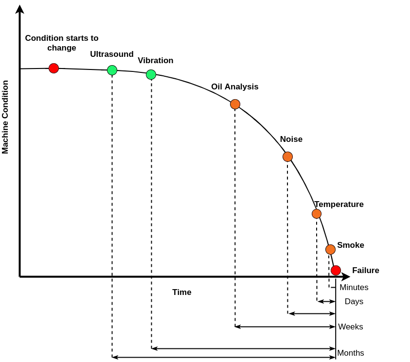 Som du kan se fra diagrammet ovenfor er røg og højere temperaturer de sidste symptomer, der viser ændringer i en komponenttilstand før et nedbrud opstår. Disse kan give dig indikationer på, at fejlen snart vil ske.