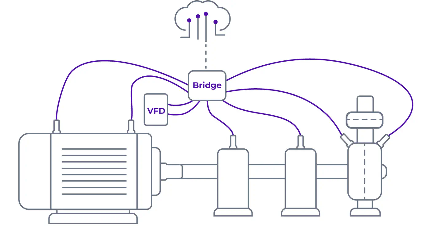 Sensorne i dette tilfælde kunne være en vibrationsensor eller en PT100 temperatur sensor. For at samle data op fra vores sensorer har vi behov for en bro som er en enhed der kan samle data fra sensorer og frekvensomformere. Grunden til at en bro også skal samle data op fra frekvensomformere er at vi bl.a. skal benytte RPM på det roterende grej men også strømforbrug er interessant når vi skal estimere levetid.