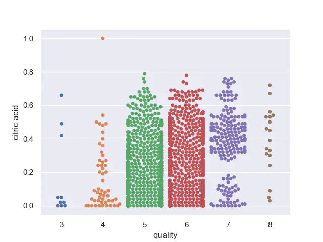 In general in all swarmplots, almost all classes except where quality is 5 and 6, indicates that there are some outliers. One issue with the quality level of 3 and 8, is the small amount of representatives, making it hard to find a pattern.
