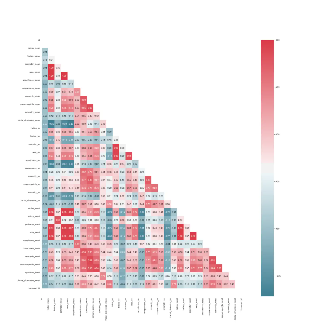 The first thing we do is to change our output variable from B and M to a binary: 0 and 1. After that, we remove the NaN-values before making a correlation HeatMap using Spearman’s correlation.