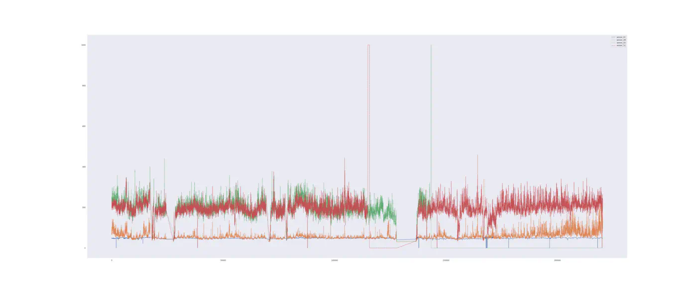For testing condition-based maintenance via control charts we will use the same water pump dataset as we used for predictive maintenance as this gives us the opportunity to compare the two approaches. We know that the data has a somewhat stable pattern with a few outliers when the water pump runs normally (see below). This should make it easy for a control chart to spot!