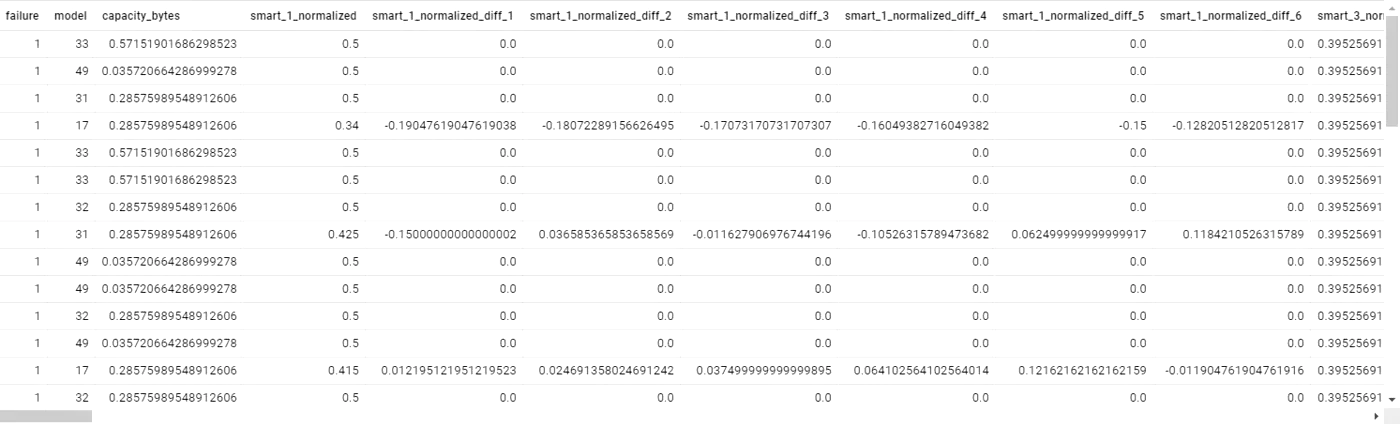 Dette vil efterlade os med 7 “begivenheds bags”, som hver indeholder en 7-dages historisk kontekst. I denne historiske sammenhæng vil der være et antal S.M.A.R.T. parametre for hver dag. Vi kan foretage nogle beregninger af disse parametre, såsom procent-forskellen i en parameter siden i går, 1 dage, 3 dage, 5 dage osv.