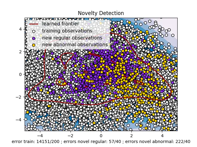 Billedet ovenfor visualiserer, hvordan en One Class SVM fungerer. Det er ikke sådan, vores endelige model ser ud,da den model ville have været en 29-dimensionel figur, fordi vi har 29 funktioner. Figuren er imidlertid en One class VSMS, der er trænet i de to funktioner med størst betydning (skaber en 2D) - og er derfor mere ustabil end vores originale model, vi viser nedenfor.