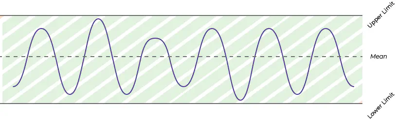 De to første tilgange fungerer lige ud af landevejen. Men lad os nu fokuserer på vibrationsanalyse og kontroldiagrammer. Dette er den tilgang, der ligner mest prædiktiv vedligeholdelse, da de bruger data af samme type og frekvens. Ved at bruge kontroldiagrammer på vibrationsdata fra dit udstyr kan du få en indikation af, hvornår din maskine begynder at opføre sig anderledes. Når værdier observeres uden for den øvre og nedre kontrolgrænse betyder det, at din proces statistisk set er ude af kontrol på dette tidspunkt. Dette vises på nedenstående figur, værdier inden for det grønne område betragtes som normale og værdier over eller under grænserne betragtes som unormale.