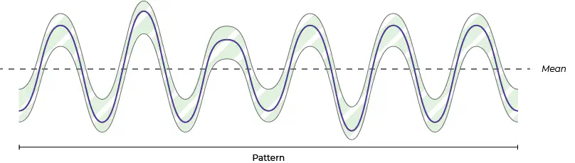 Det er dog mønstre i en længere serie vi er interesseret i, hvis vi gerne vil sige noget om udstyrets tilstand. Tilstandsbaseret vedligeholdelse via kontroldiagrammer kan kun sige noget om de observationer, der falder uden for kontrolgrænserne, mens prædiktiv vedligeholdelse ved brug af maskinlæring også kan finde væsentlige ændringer inden for kontrolgrænserne. Dette er den største forskel mellem tilstandsbaseret vedligeholdelse og prædiktiv vedligeholdelse.